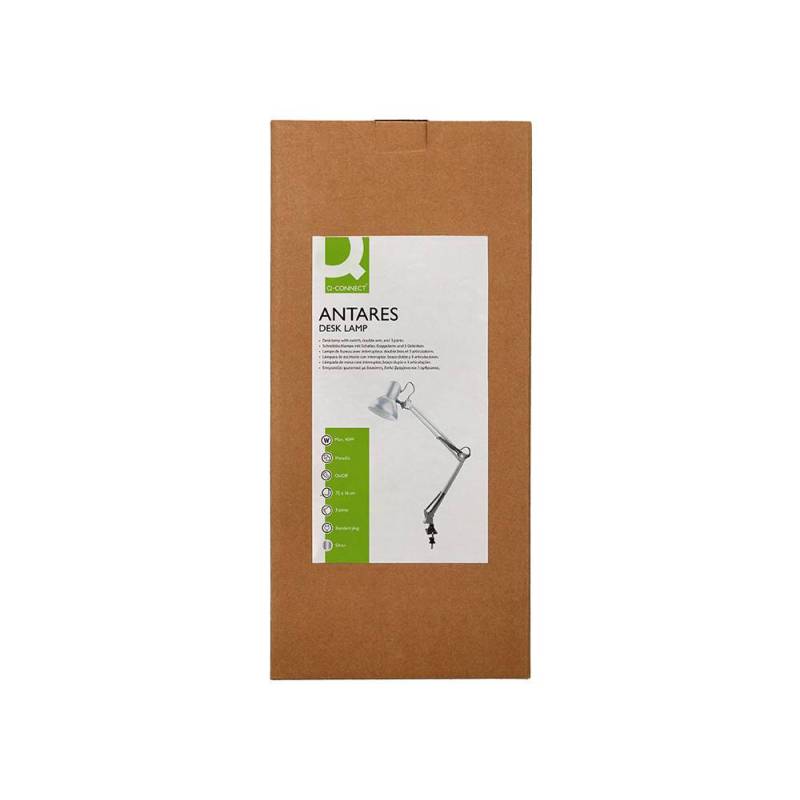 La lámpara de escritorio Q-Connect Antares combina funcionalidad y diseño moderno para ofrecer una iluminación focalizada y ajustable en ambientes de trabajo o estudio. Su estructura metálica en color plata garantiza resistencia y estabilidad, mientras que su sistema de pinza permite una instalación práctica sin ocupar espacio en la superficie del escritorio.