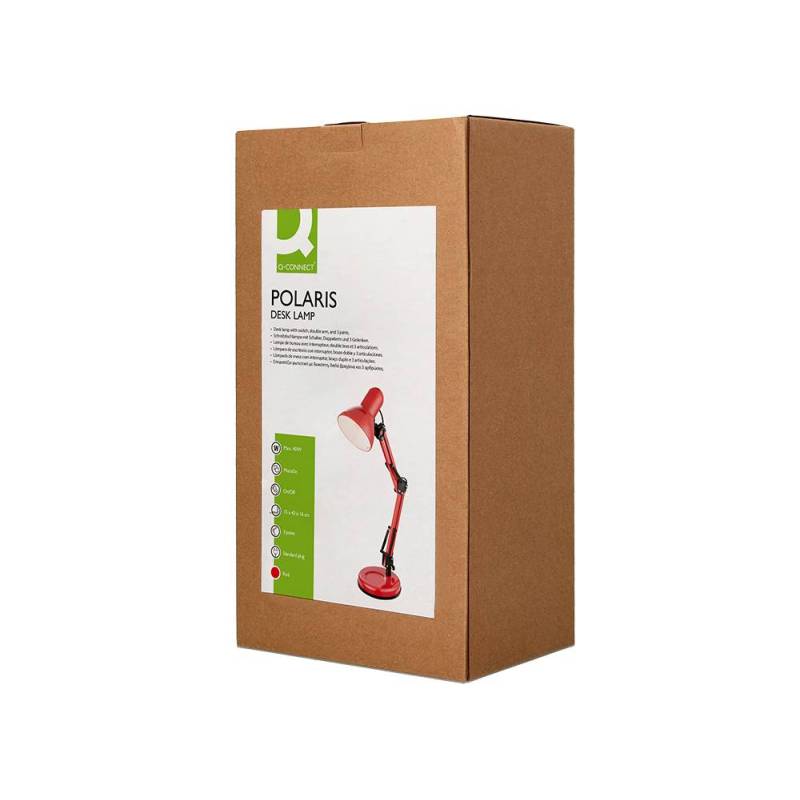 La lámpara de escritorio Q-Connect Polaris metálica en color rojo es una solución práctica y duradera para iluminar espacios de trabajo o estudio. Su estructura robusta y brazo articulado con tres puntos de movilidad permiten ajustar la luz con precisión, ofreciendo una iluminación eficiente y adaptable a distintas necesidades.