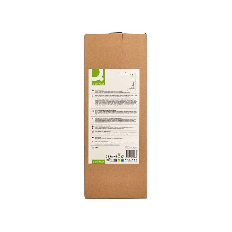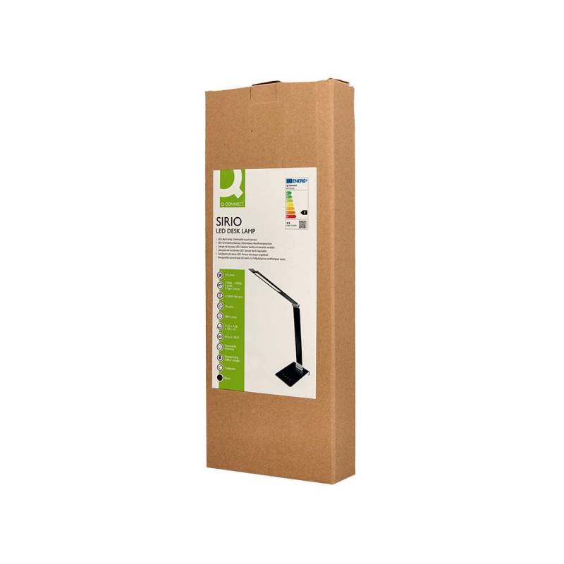La lámpara de escritorio Q-Connect Sirio LED 13W es una solución eficiente y versátil para iluminar espacios de trabajo o estudio. Su diseño moderno en color negro incorpora una estructura metálica resistente que garantiza durabilidad y estabilidad, al mismo tiempo que ofrece un control táctil intuitivo para ajustar la iluminación según las necesidades del usuario. - Potencia y tecnología: 13W con 64 LEDs que proporcionan un flujo luminoso de 800 lúmenes, ofreciendo una luz brillante y homogénea.