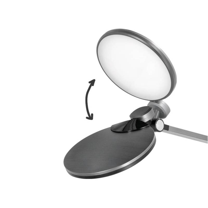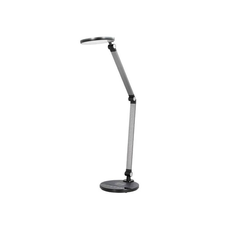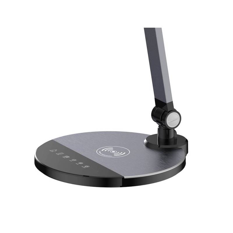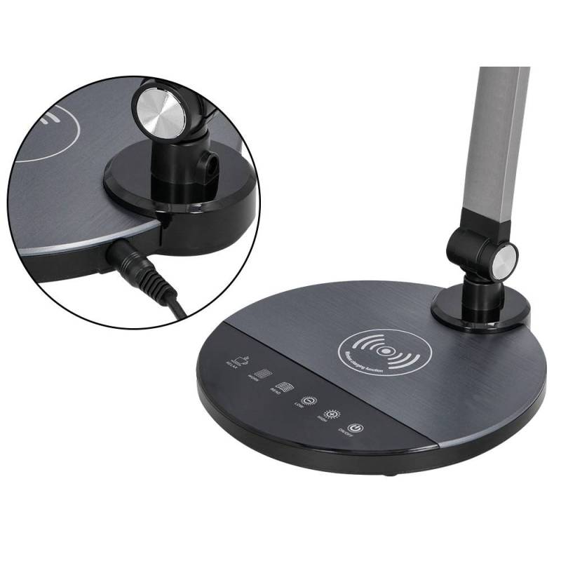 Lampara de sobremesa fabricada en abs con acabado alumium. Interruptor táctil, ajuste de temperatura de 3 colores, atenuación continua. Carga inalámbrica rapida para los dispositivos compatibles con luz indicando el nivel de carga. Cabeza y brazo orientable. Tira de 120 led, flujos luminosos 1.300 lux. Cct: 3.000k-6.500k. Lumen: 480lm. Potencia 9 w. Hasta 20.000 horasde duración. Medidas: 192 x 150 x 905 mm. Color negro. |