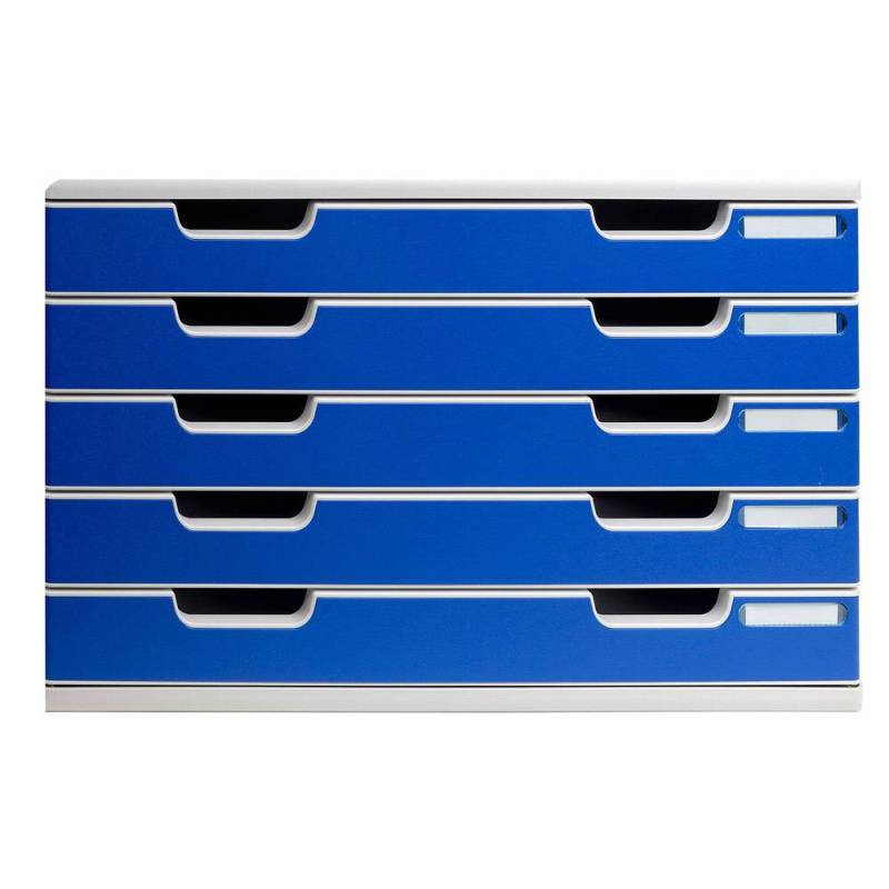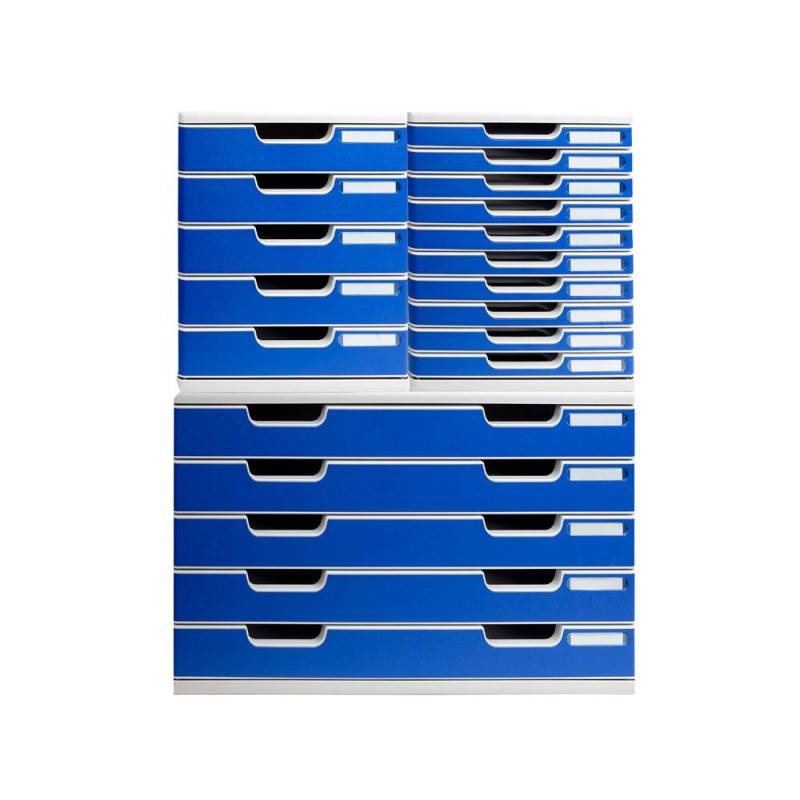 Este módulo de cajones sobremesa presenta una solución práctica y elegante para el almacenamiento y organización de documentos de gran formato. Con 5 cajones independientes fabricados en poliestireno, combina funcionalidad y resistencia en un diseño compacto y apilable, ideal para optimizar espacios de trabajo en oficinas, talleres o centros educativos.
