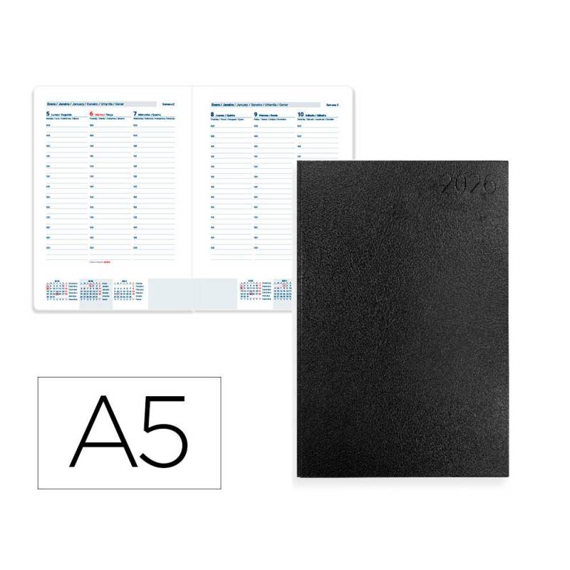 AGENDA ENCUADERNADA LIDERPAPEL CORFU A5 2026 SEMANA VISTA NEGRO PAPEL 60 GR