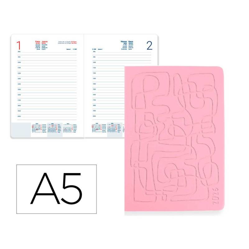 Organiza tu año 2026 con esta agenda encuadernada en formato A5, diseñada para ofrecer funcionalidad y estilo en cada página. Su elegante tapa rígida de simil piel en color rosa combina durabilidad con un toque moderno gracias a un relieve abstracto lineal en su portada. Con un diseño pensado para facilitar la planificación diaria, esta agenda Día Página te permitirá gestionar tus tareas, citas y compromisos de manera detallada y eficiente.