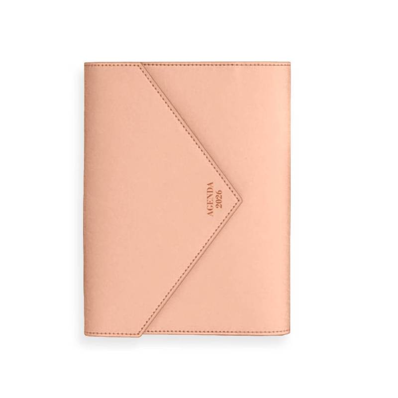 Descubre la agenda anual 2026 con formato A5 que combina funcionalidad, estilo y sostenibilidad. Con un diseño en tono rosa nude y encuadernación en simil piel rígida, ofrece un aspecto sofisticado y una gran resistencia para el uso diario. Su planificación de día por página permite organizar tareas, citas y notas con amplitud y claridad, siendo una herramienta perfecta para quienes valoran el orden y la elegancia en su rutina.