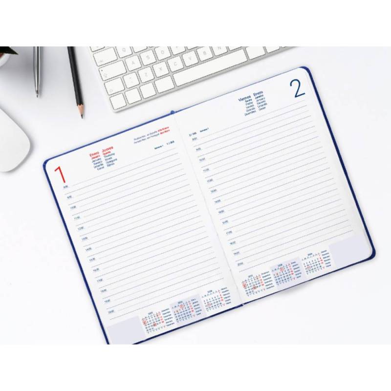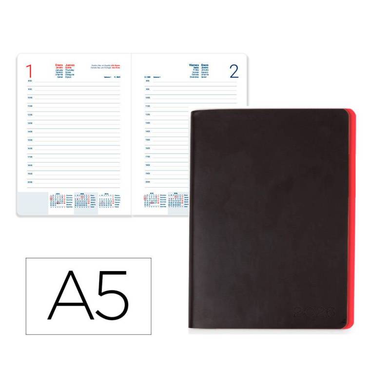 Organiza tu año 2026 con esta agenda encuadernada de tamaño A5, diseñada para ofrecer funcionalidad y estilo en un formato compacto. La tapa en simil piel roja aporta un acabado elegante y resistente, ideal para el uso diario tanto en entornos profesionales como personales. Su contenido incluye herramientas prácticas como calendario trienio, planning anual, feriados de España y Portugal, y mapas de usos horarios, facilitando una planificación completa y detallada.