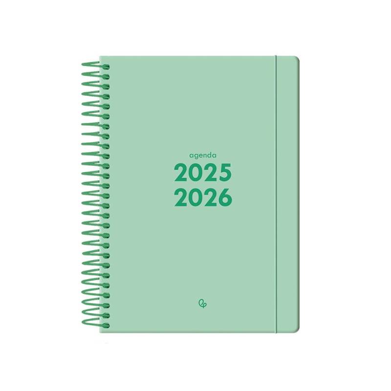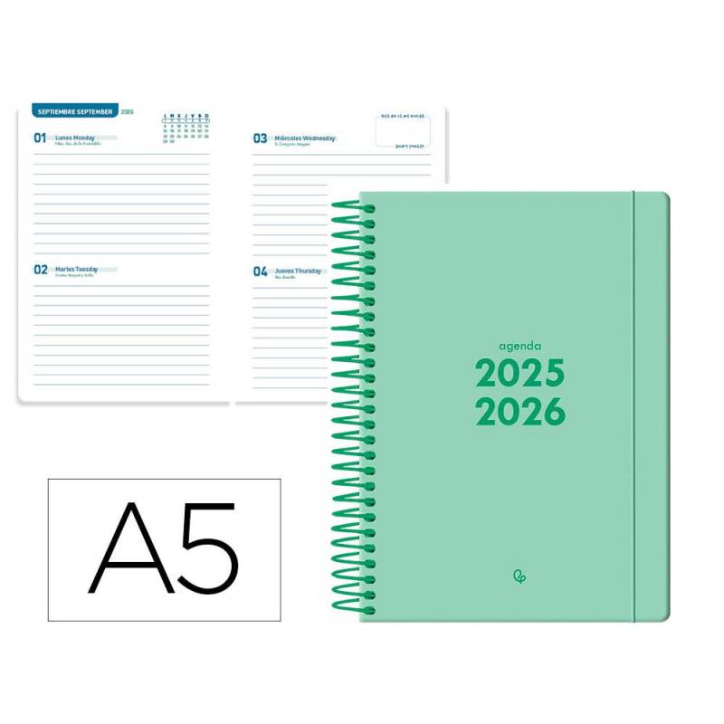 AGENDA ESCOLAR LIDERPAPEL 25-26 ESPIRAL BASIC VERDE MENTA 2 DIAS PAGINA A5 BILINGÜE PAPEL FSC 70 GR