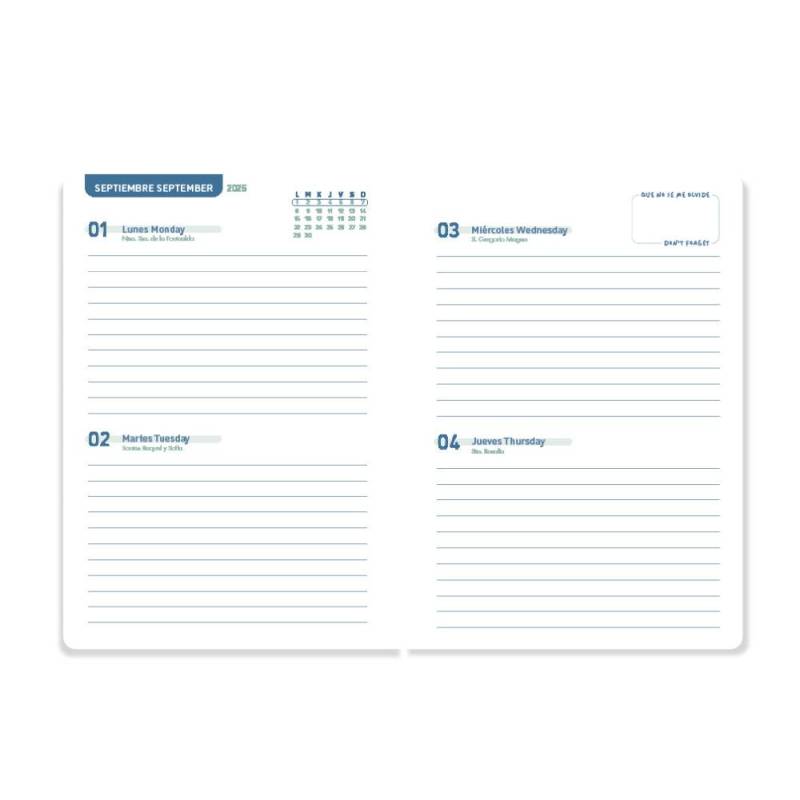 Prepárate para el nuevo curso con la agenda escolar 2025-2026 Liderpapel Basic en color verde menta. Diseñada para ayudarte a mantener todas tus tareas y actividades bajo control, esta agenda es la herramienta perfecta para enfrentar el año académico con confianza. Su formato de dos días por página proporciona suficiente espacio para anotar todas tus notas y tareas diarias, mientras que su contenido bilingüe es ideal para estudiantes en programas de doble idioma.