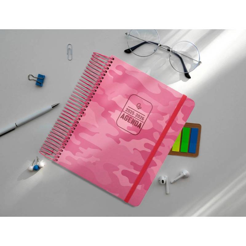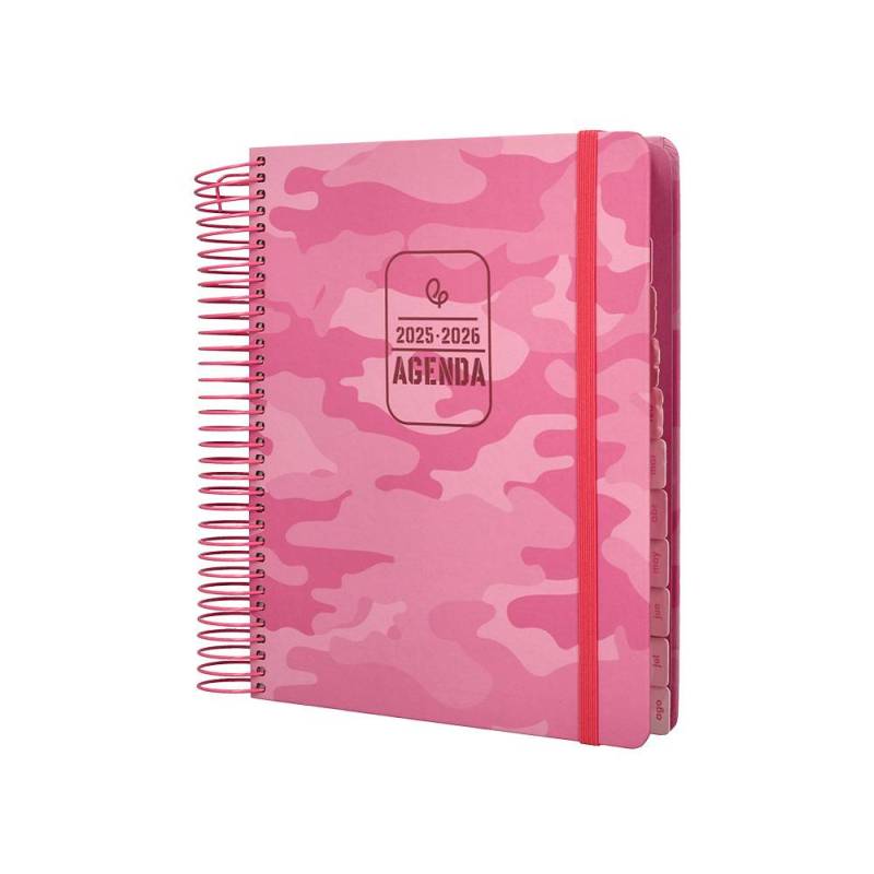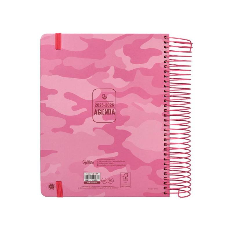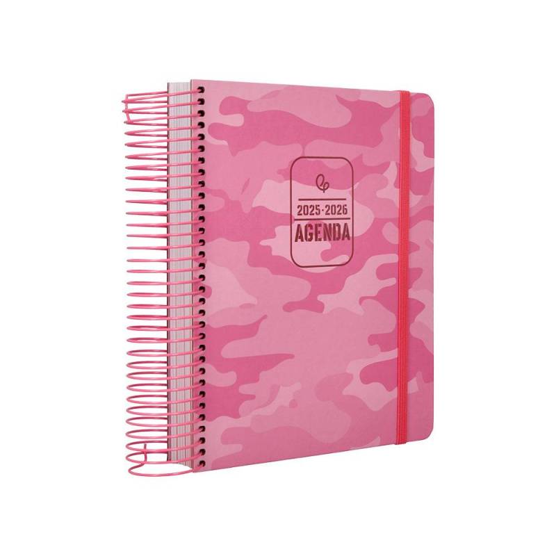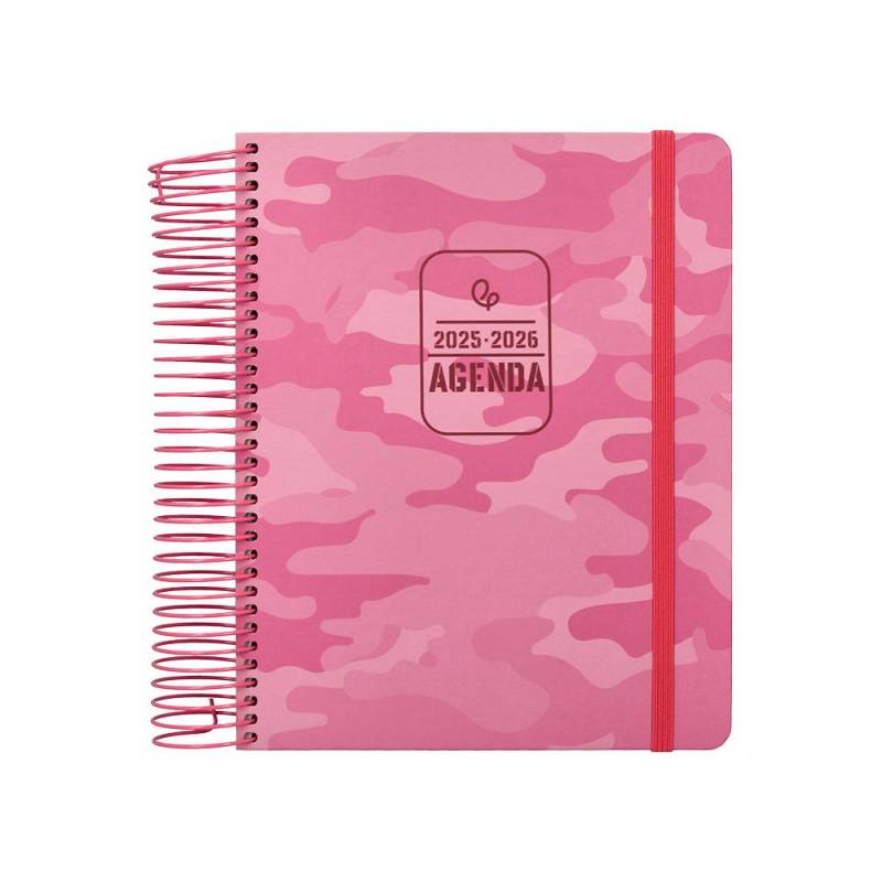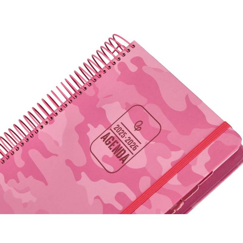 AGENDA ESCOLAR LIDERPAPEL 25-26 ESPIRAL PATTERNS MILITAR ROSA DIA PAGINA A5 BILINGÜE PAPEL FSC 80 GR