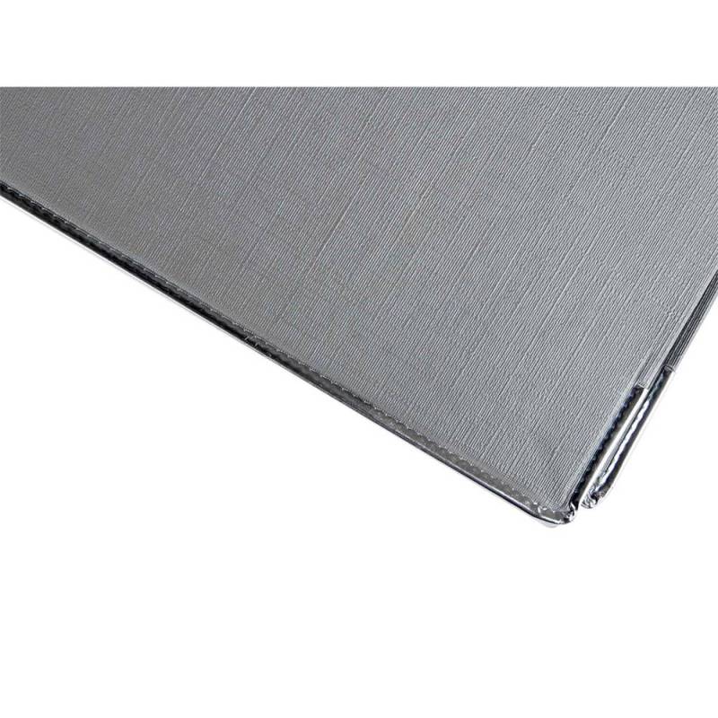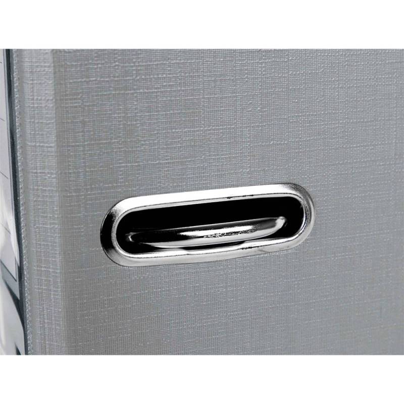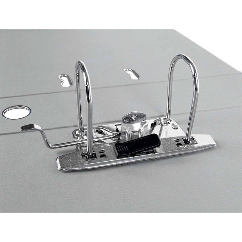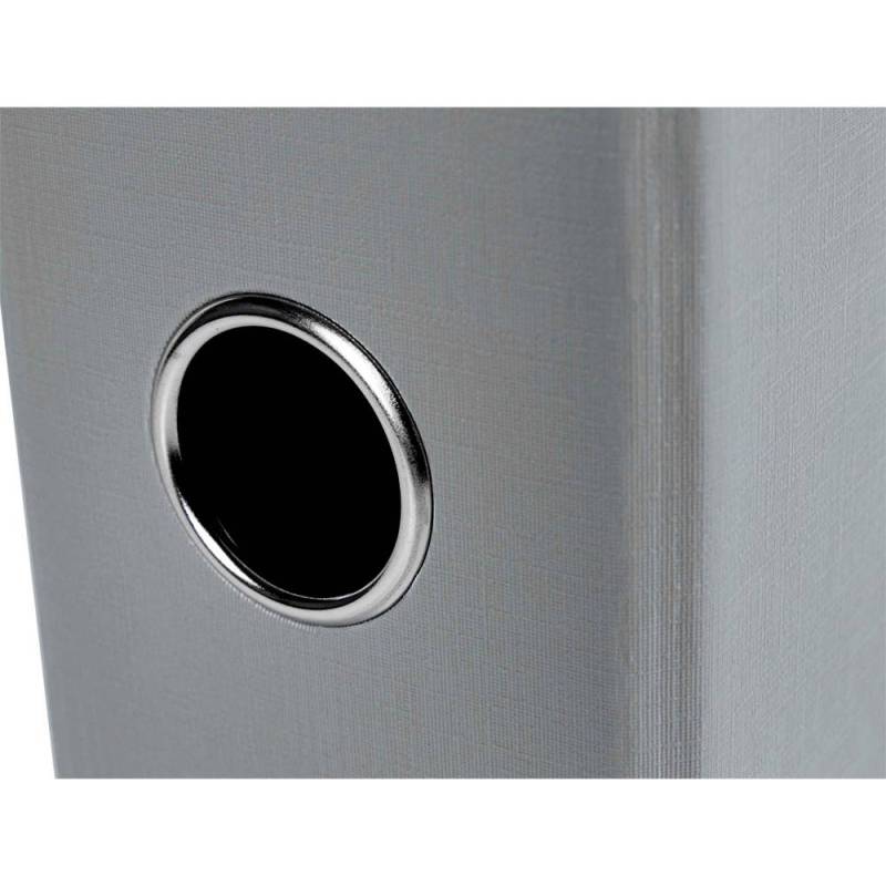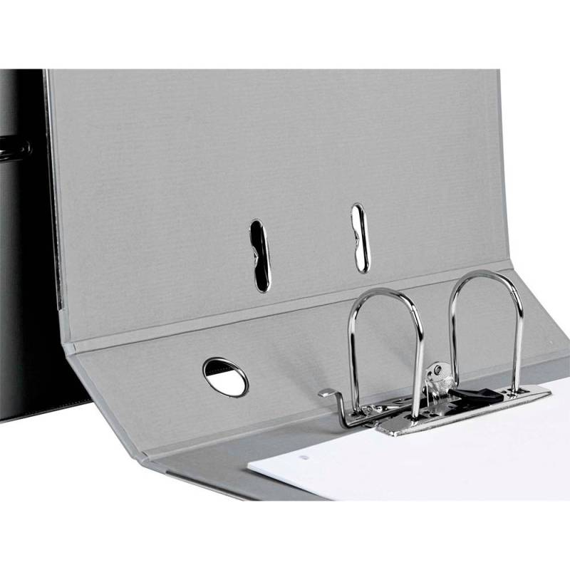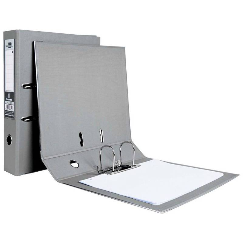 Archivador de palanca Liderpapel Documenta. Archivador de cartón entrecolado. Forrado PVC. Con mecanismo de palanca y compresor niquelado. Cantoneras largas. Porta tarjetero en el lomo. Con rado y ollao. Guarda impresa a color. Tamaño folio. Color gris. 2 anillas de 75 mm. Lomo de 75 mm. Medida: 350 x 287 mm.