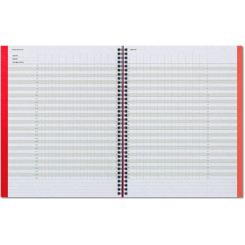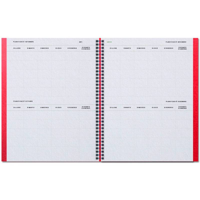 Cuaderno para los docentes. Planificación anual y mensual del curso. Programación, vista semanal vertic al a doble página con espacio para las prioridades diarias y para anotaciones semanales. Evaluación, para 6 grupos de hasta 35 alumnos. Reuniones, 48 fichas. Anotaciones, páginas en blanco para ideas, esquemas, planes... O para pegar los documentos del centro. Formato: 160 páginas, encuadernación doble espiral con goma elástica. Con 3 marcapáginas. Acabados premium, certificado fsc. Catalán. cuaderno profesorado |
