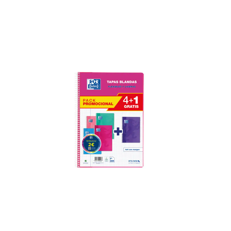 CUADERNO ESPIRAL OXFORD TAPA BLANDA FOLIO 80 HOJAS 90GR CUADRO 4 MM COLORES TENDENCIAS PACK DE 4+1