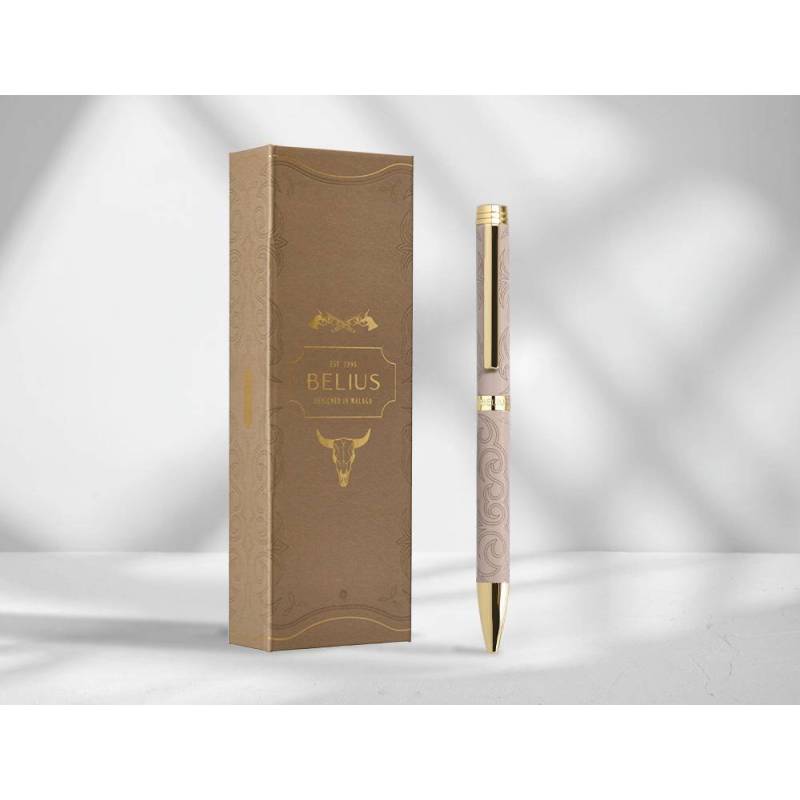 BOLIGRAFO BELIUS WILD WEST ALUMINIO COLOR BEIGE DORADO TINTA COLOR AZUL CAJA DE DISEÑO