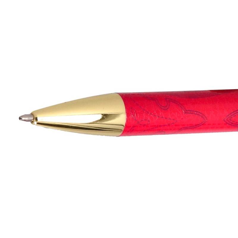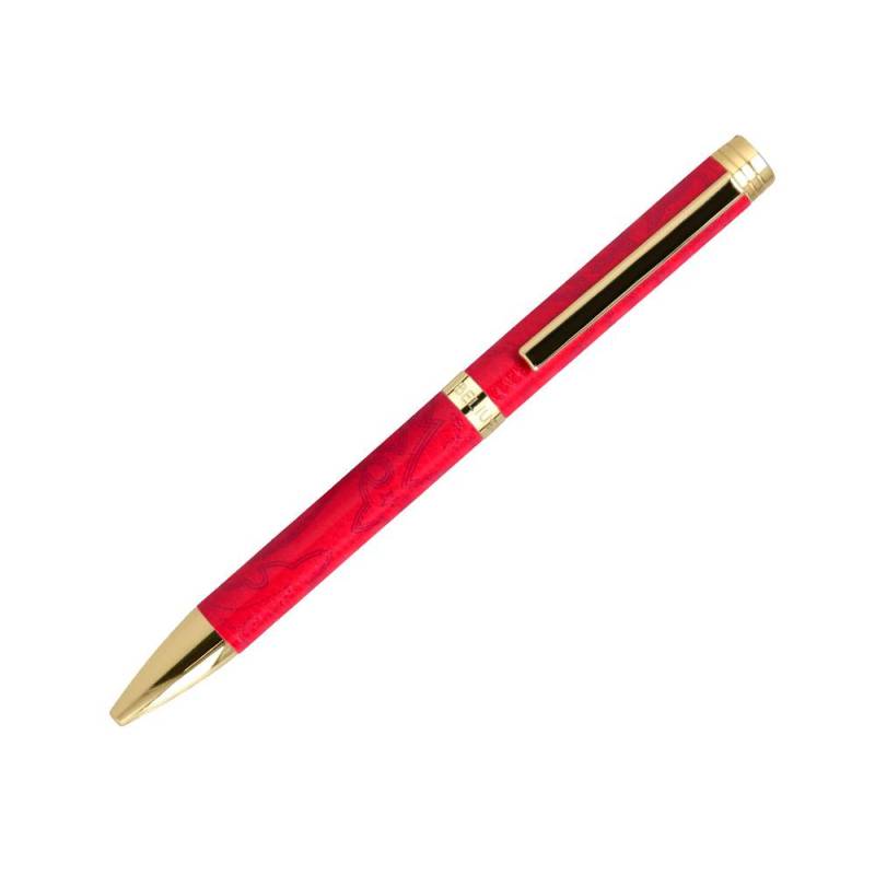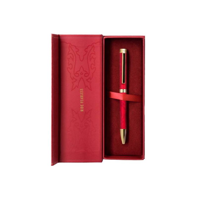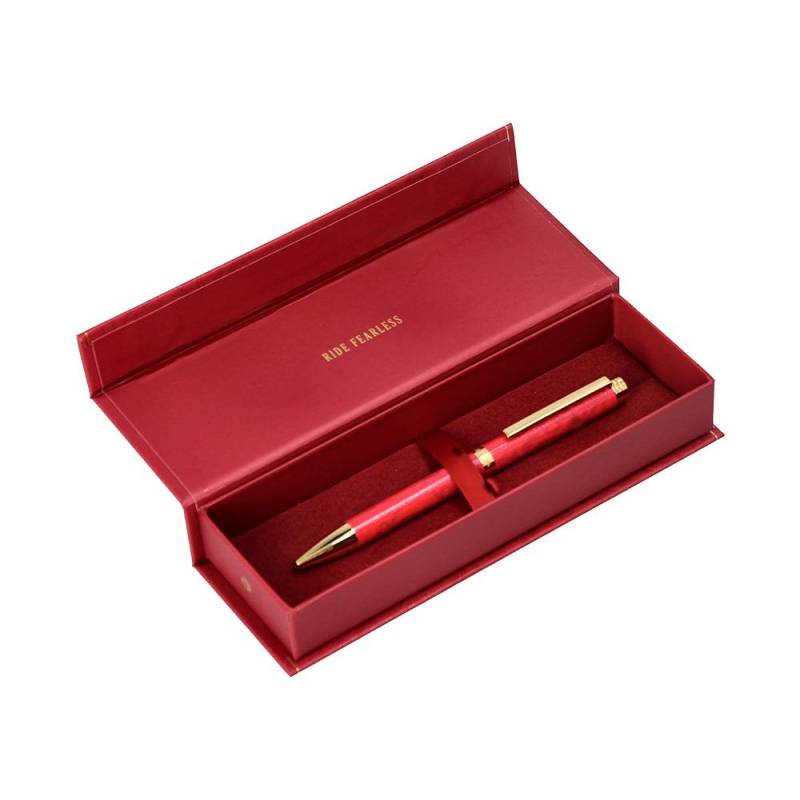 Este bolígrafo combina la inspiración del estilo western con una fabricación moderna y resistente en aluminio, ofreciendo un diseño exclusivo que destaca por su acabado en color granate con detalles dorados. Su tinta azul garantiza una escritura suave y precisa, mientras que la presentación en caja de diseño lo convierte en una opción ideal para regalo o para quienes aprecian un instrumento de escritura con carácter y elegancia.