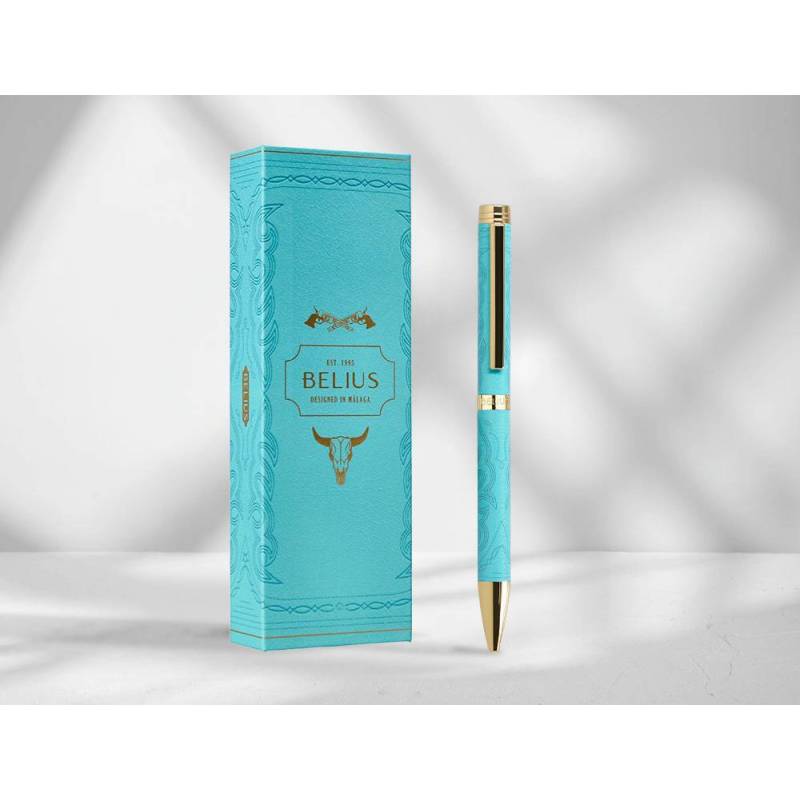 BOLIGRAFO BELIUS WILD WEST ALUMINIO COLOR TURQUESA DORADOTINTA COLOR AZUL CAJA DE DISEÑO