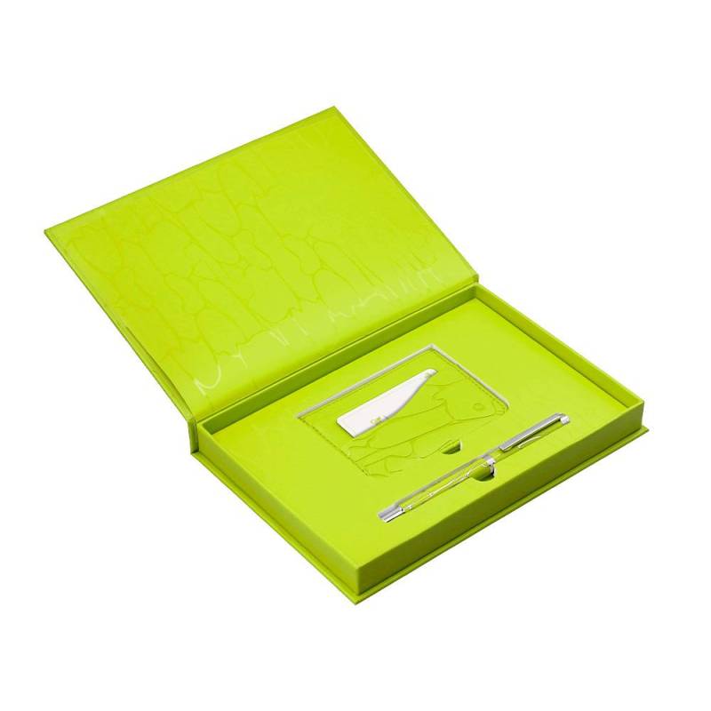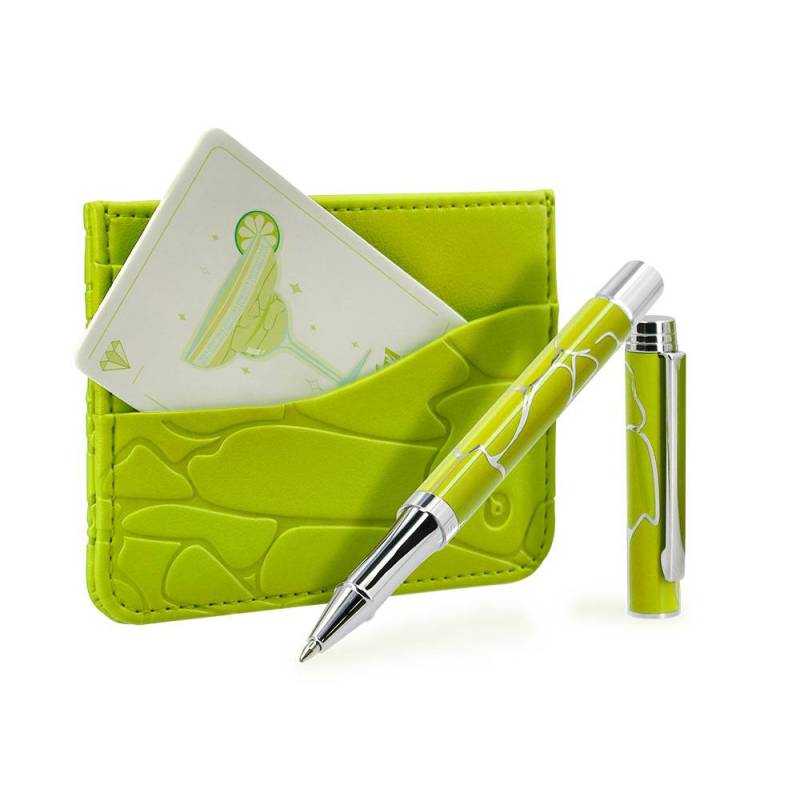 BOLIGRAFO Y WALLET BELIUS COCKTAILS MARGARITA ALUMINIO VERDE LIMA PLATEADO RELIEVE TINTA COLOR AZUL CAJA DE
