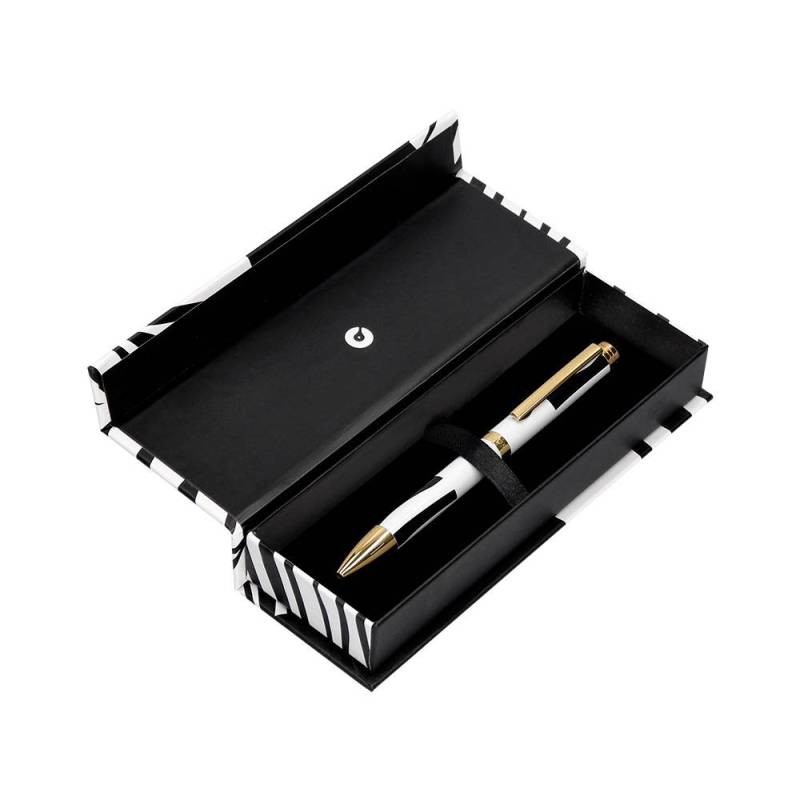 El bolígrafo dualità combina un diseño moderno y atrevido, con un cuerpo en blanco decorado con trazos estilo cebra en negro y detalles metálicos dorados. Viene presentado en una moderna caja de cierre magnético que juega con la inversión de colores, incorporando una solapa interior en contraste. El diseño en blanco y negro invertidos representa el contraste y la dualidad presentes en la juventud, capturando su energía. La colección se caracteriza por su diseño elegante, contemporáneo con un estilo único. Cada detalle ha sido cuidadosamente elegido para crear un impacto visual fuerte y llamativo. Tinta color azul. Grosor tamaño 1 mm. |