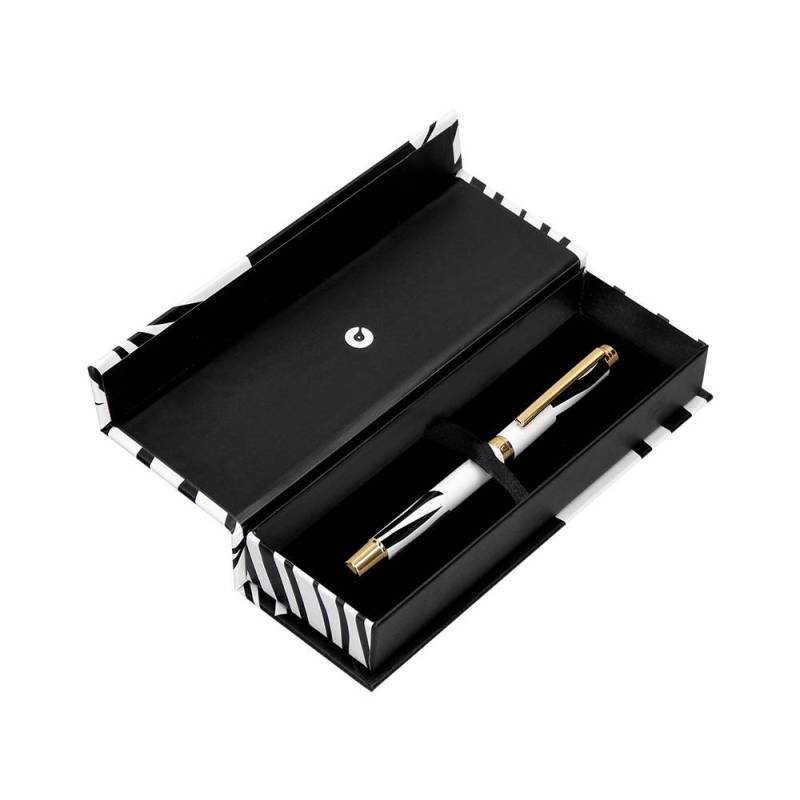 El roller dualità combina un diseño moderno y atrevido, con un cuerpo en blanco decorado con trazos estilo cebra en negro y detalles metálicos dorados. Viene presentado en una moderna caja de cierre magnético que juega con la inversión de colores, incorporando una solapa interior en contraste. El diseño en blanco y negro invertidos representa el contraste y la dualidad presentes en la juventud, capturando su energía. La colección se caracteriza por su diseño elegante, contemporáneo con un estilo único. Cada detalle ha sido cuidadosamente elegido para crear un impacto visual fuerte y llamativo. Tinta color negro. Grosor tamaño 0,7 mm. |