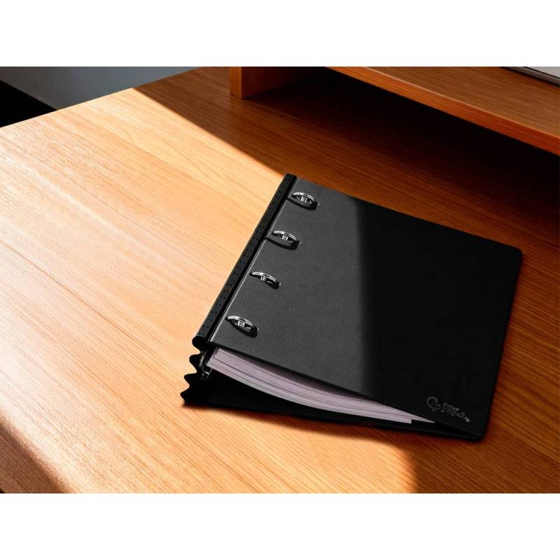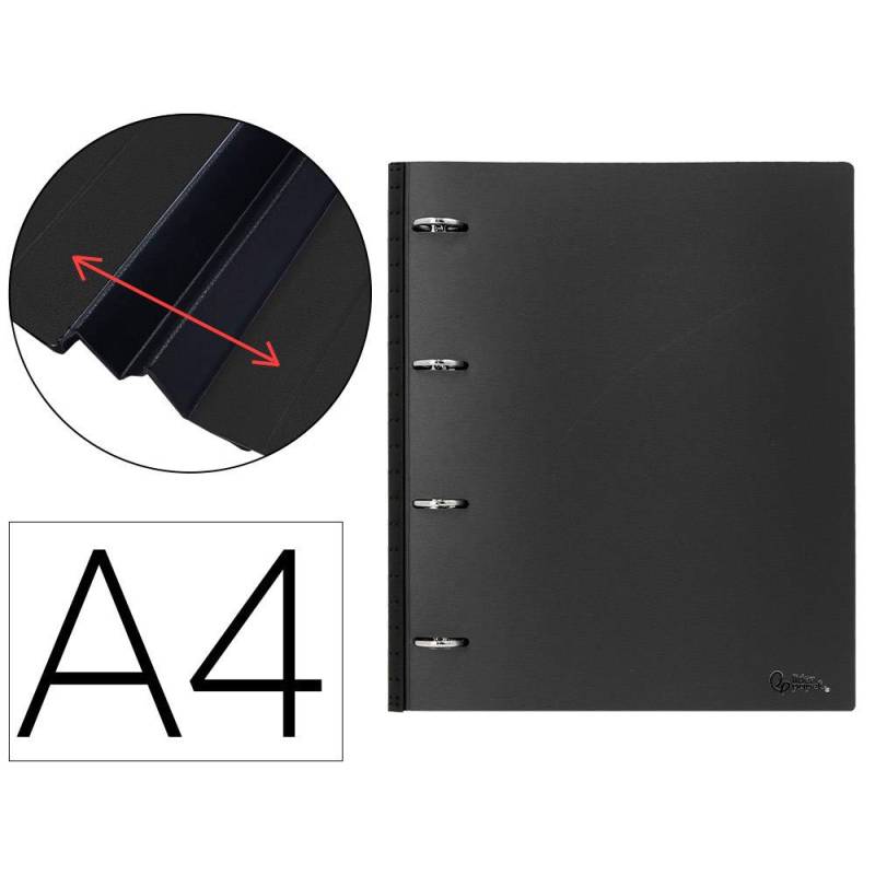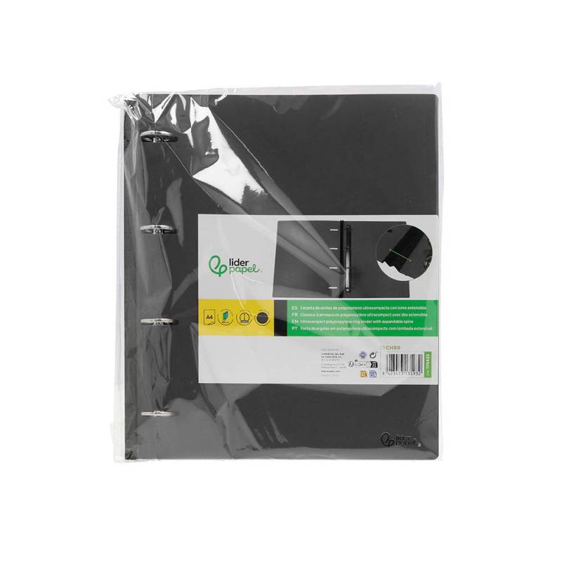 Esta carpeta de 4 anillas redondas con diámetro de 25 mm está diseñada para organizar documentos tamaño DIN A4 de manera eficiente y práctica. Fabricada en polipropileno de 700 micras, destaca por su resistencia y durabilidad, además de presentar un diseño ultra compacto que optimiza el espacio de almacenamiento y transporte. Su lomo extensible de hasta 4 cm permite ajustar la capacidad según la cantidad de hojas, aportando flexibilidad sin perder comodidad.