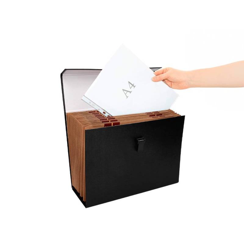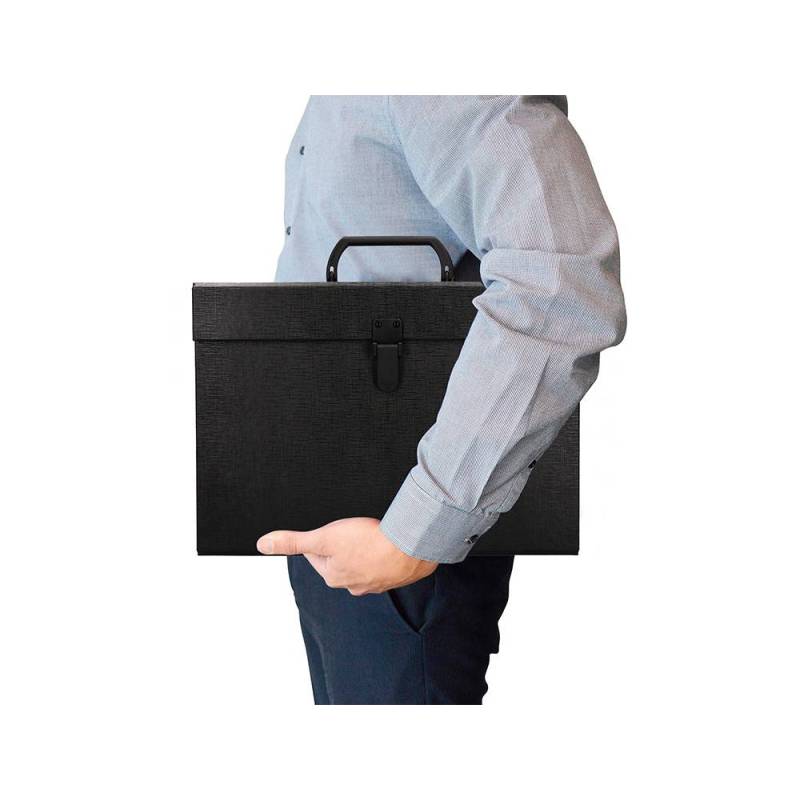 Este maletín tipo acordeón está pensado para ofrecer una solución práctica y ordenada en el almacenamiento y transporte de documentos. Fabricado en cartón forrado de alta resistencia, combina ligereza con funcionalidad, permitiendo organizar hasta 19 secciones diferentes gracias a sus departamentos con fuelle. Su diseño en color negro aporta un acabado profesional, ideal para entornos laborales y académicos.