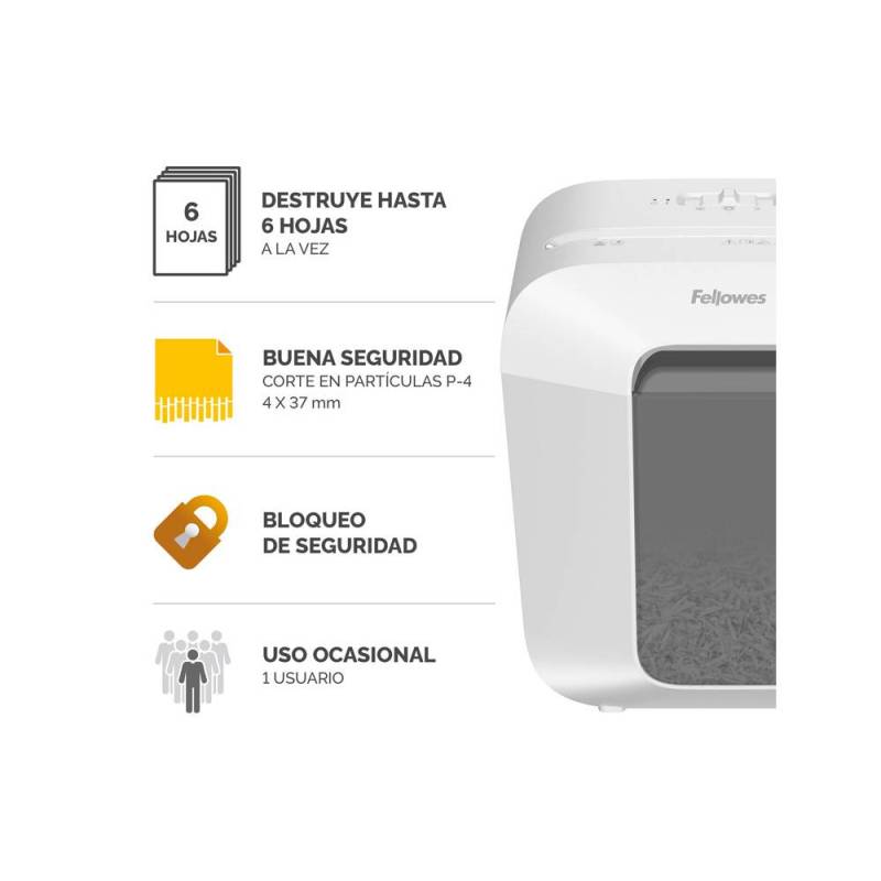 DESTRUCTORA DE DOCUMENTOS FELLOWES LX25 CAPACIDAD 6H SEGURIDAD P4 DESTRUYE GRAPAS CLIPS Y TARJETAS