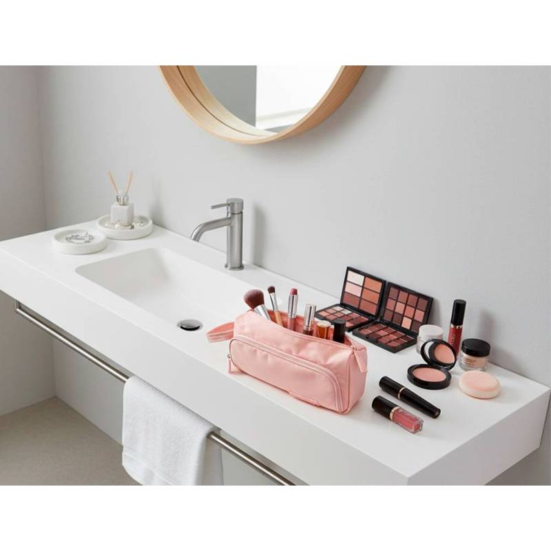 Este estuche portatodo presenta un diseño compacto y funcional, ideal para mantener organizados tus útiles escolares o de oficina. Con dos cremalleras independientes y un bolsillo interior, facilita el acceso rápido y la separación de objetos, todo en un color rosa pastel que aporta un toque de suavidad y estilo moderno.