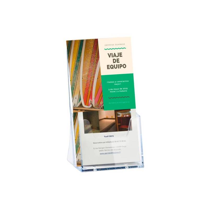 Este expositor sobremesa está especialmente diseñado para la presentación y organización eficiente de folletos y documentos en formato A5 en posición vertical. Fabricado en poliestireno transparente, combina resistencia y estabilidad, facilitando una visualización clara del contenido y un acceso rápido gracias a su hendidura frontal. Su diseño compacto y robusto lo hace ideal para entornos profesionales que requieren una presentación ordenada y accesible de material informativo.
