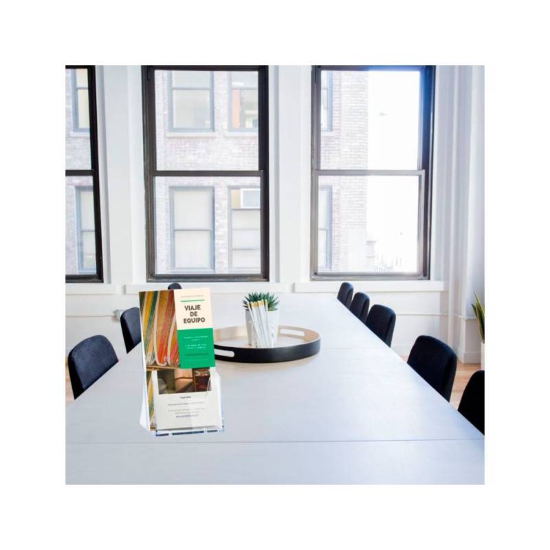 Este expositor combina funcionalidad y diseño discreto para integrarse en cualquier espacio de trabajo o atención al público, facilitando el acceso y la visibilidad del contenido A5. Su construcción en poliestireno transparente aporta una estética limpia que no distrae, mientras que su robustez permite un uso continuado en entornos con alta afluencia.
