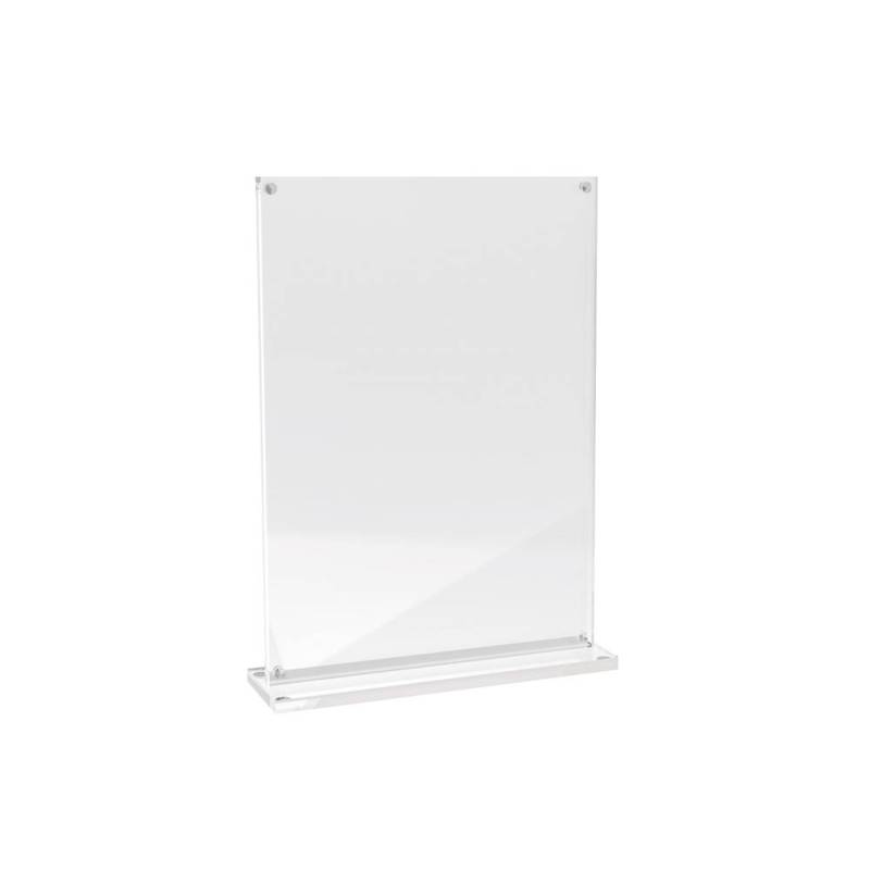 Este expositor sobremesa en acrílico transparente es una solución práctica y elegante para la exhibición de documentos en formato DIN A5 (148 x 210 mm). Su diseño robusto y compacto, con dimensiones de 167 x 47 x 230 mm, facilita la presentación clara y ordenada de menús, folletos, avisos o promociones en entornos profesionales como oficinas, restaurantes, mostradores y recepciones.
