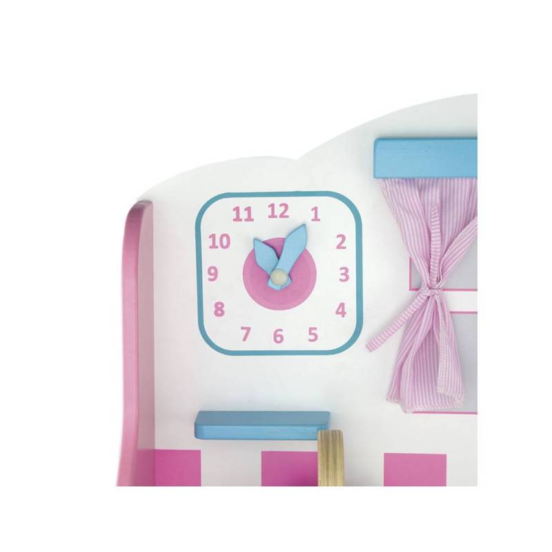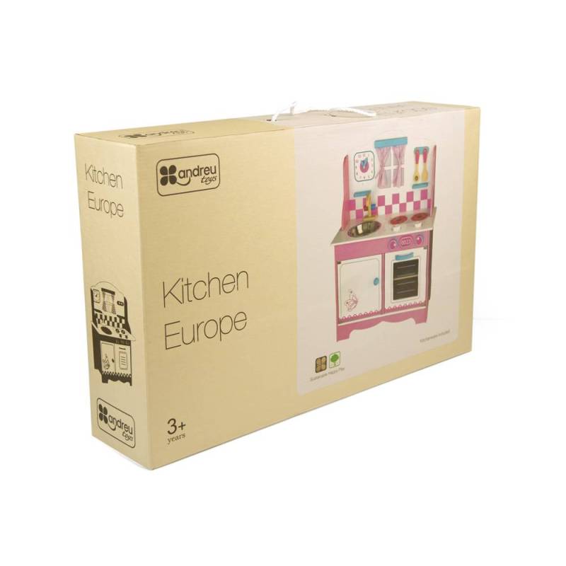 Cocinita de madera de la marca Andreutoys. Con esta cocinita los niños podrán sacar al chef que llevan dentro y así tener la posibilidad de descubrir y explorar sus artes culinarias. La cocinita incluye: 6 utensilios de cocina, reloj con saetas movibles, puertas de apertura y cierre, todos los mandos giran y hacen click, espacio de almacenamiento debajo del fregadero, fregadero extraíble para una limpieza rápida y fácil. La construcción de la cocinita es en madera sólida. Instrucciones de montaje detalladas en el. Altura del suelo a la encimera: 47,5 cm. Edad recomendada: a partir de 3 años.