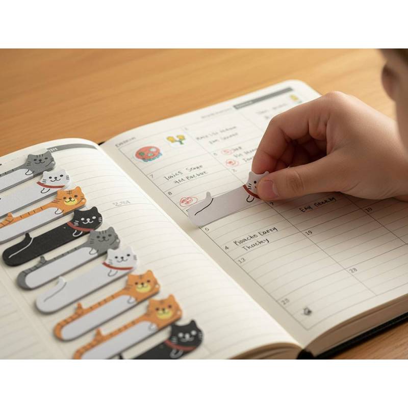 Agiliza la organización de tus documentos y materiales de estudio con estas prácticas notas adhesivas diseñadas especialmente para marcar páginas y realizar anotaciones breves. Su original diseño con forma de gato añade un toque divertido y atractivo, ideal para niños y personas que buscan un estilo diferenciado en sus útiles de papelería.