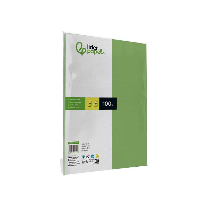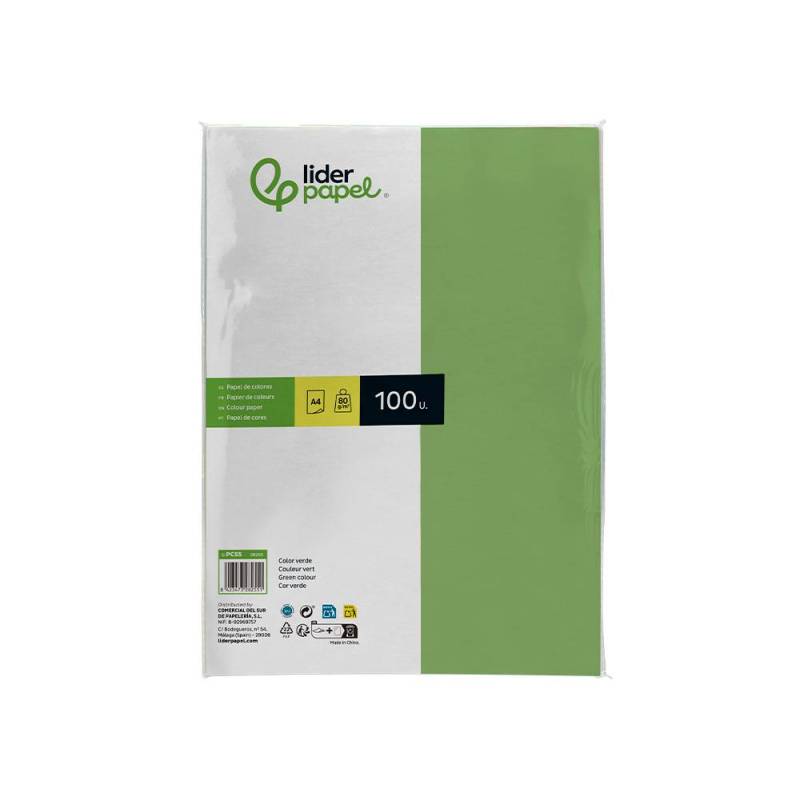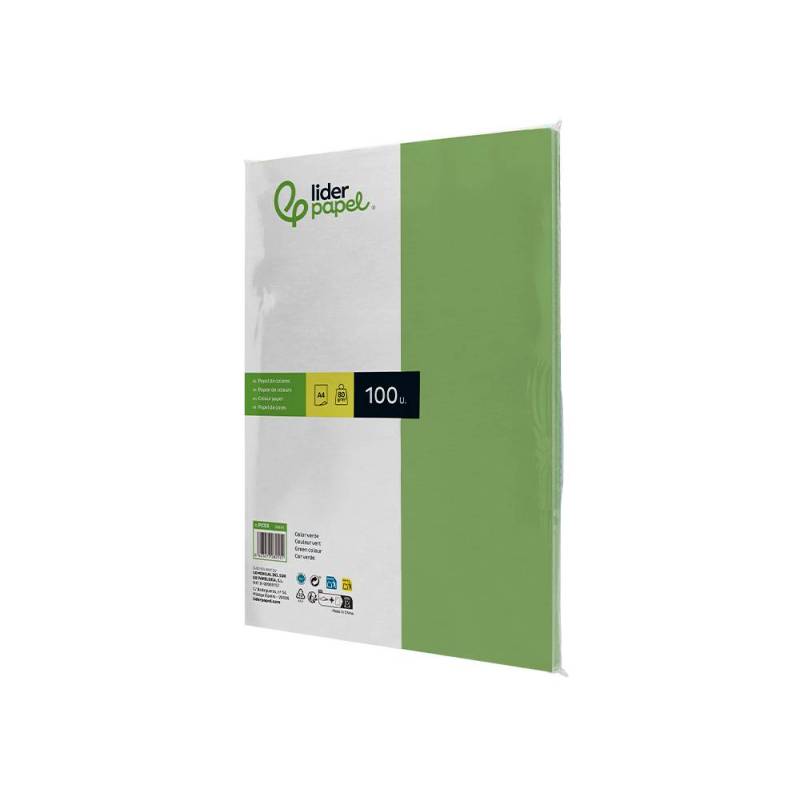 Papel color de la marca Liderpapel. Gramaje 80 g/m2. Cuenta con 100 hojas. Tamaño Din A4. Idóneos para impresoras ink-jet, láser y fotocopiadoras. Color verde.
