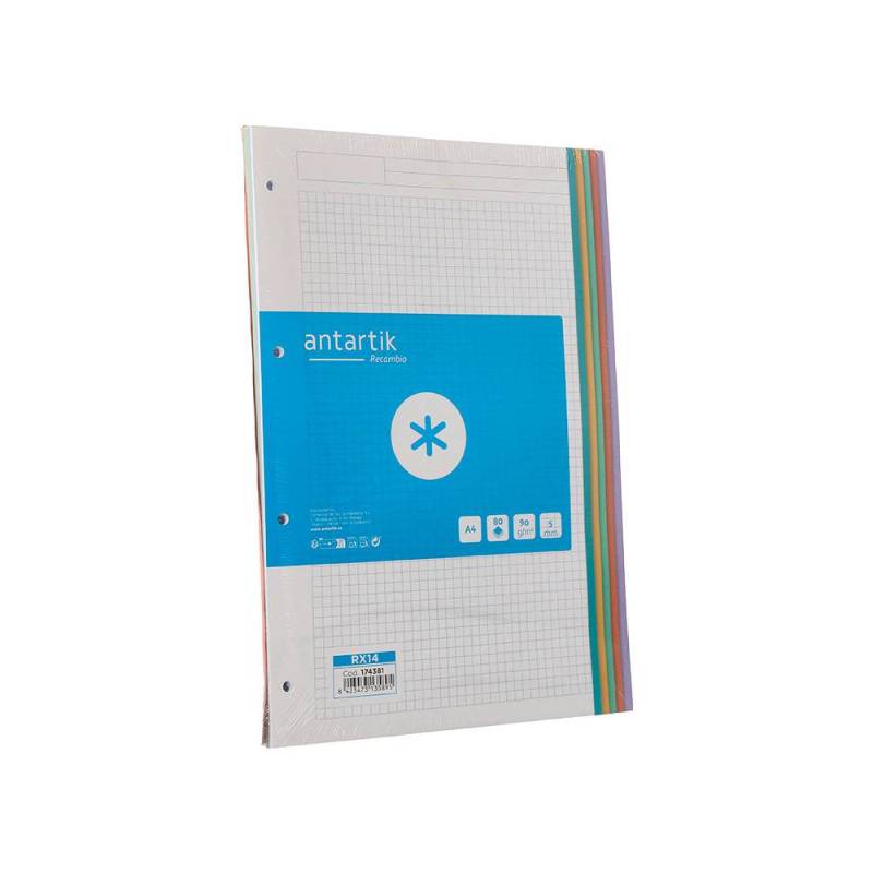 RECAMBIO A4 ANTARTIK 80 HOJAS 90G/M2 CUADRO 5 MM 4 TALADROS BANDAS DE 5 COLORES PASTELES