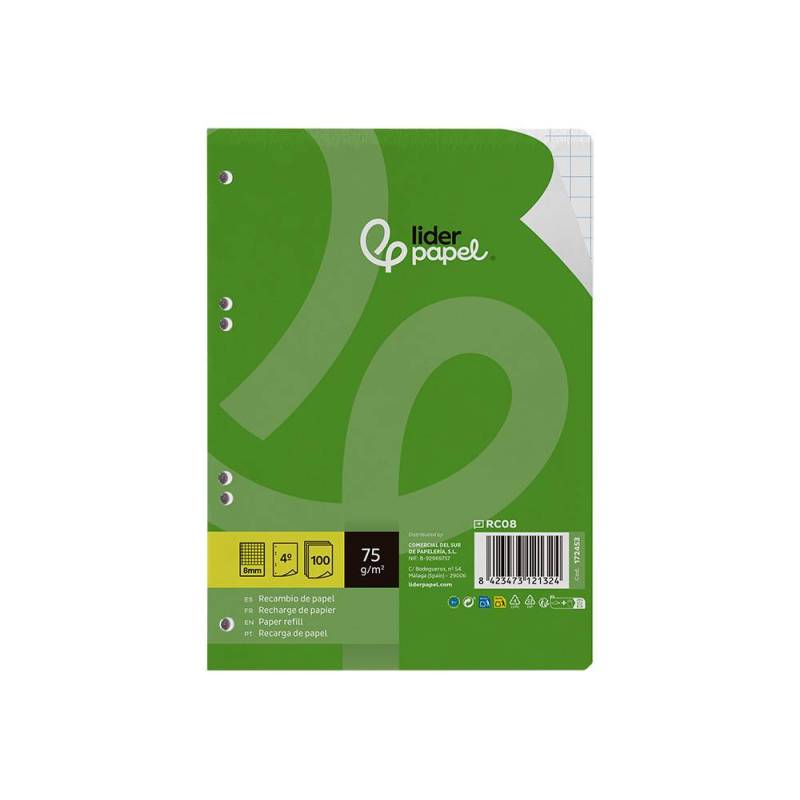 RECAMBIO LIDERPAPEL DIN A5 100 HOJAS 75 GR CUADRO 8MM CON MARGEN 6 TALADROS