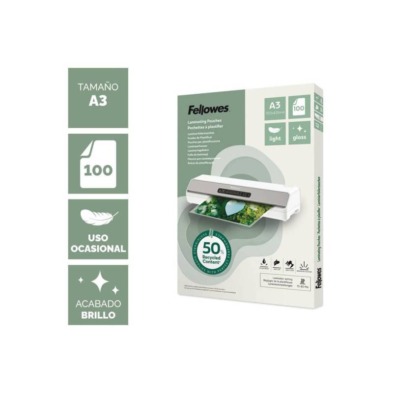 Las bolsas de plastificar Fellowes recicladas con acabado brillo en formato DIN A3 y grosor de 80 micras ofrecen una solución práctica y ecológica para proteger documentos importantes. Con un paquete de 100 unidades, están diseñadas para encapsular y preservar materiales de tamaño A3, garantizando una presentación profesional y duradera gracias a su resistencia y acabado brillante. - Material reciclado: Compuestas por un 50% PET reciclado y 50% EVA reciclado, contribuyen a la sostenibilidad y reducción del impacto ambiental.