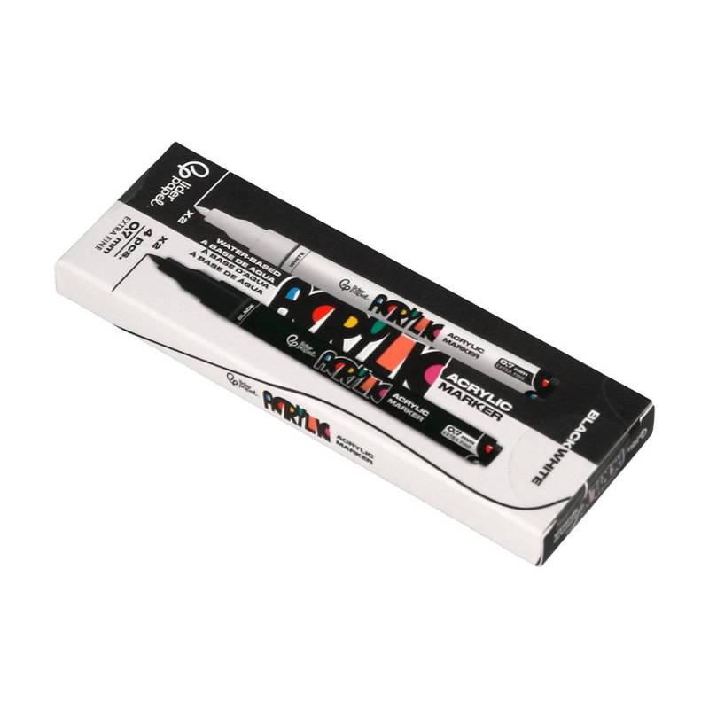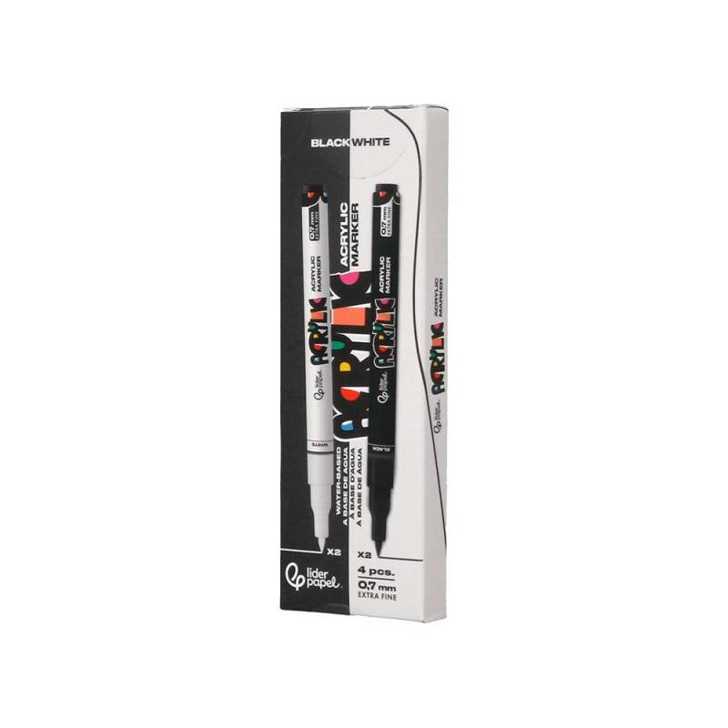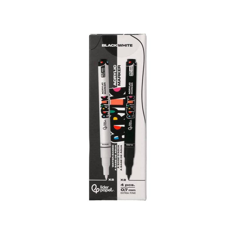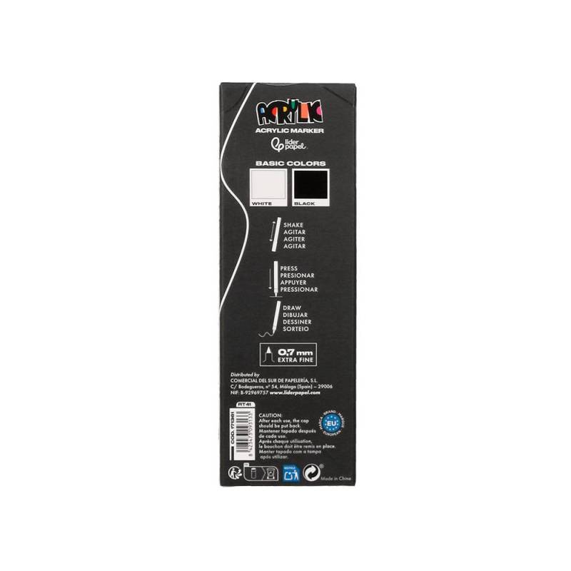 os Rotuladores Liderpapel Acrylic con base de agua ofrecen una experiencia de escritura y dibujo excepcional, adaptándose a las necesidades de artistas, estudiantes y profesionales creativos. Este conjunto de rotuladores es versátil y adecuado para una amplia gama de superficies, proporcionando detalles precisos gracias a su punta fina de 0,7 mm. La caja incluye cuatro rotuladores en colores blanco y negro, perfectos para añadir un toque clásico y elegante a cualquier proyecto, desde ilustraciones y carteles hasta tarjetas de felicitación y objetos personalizados.