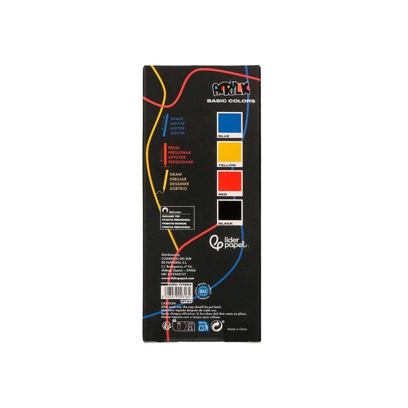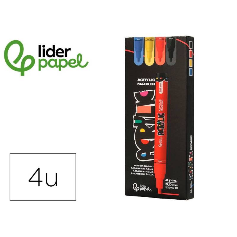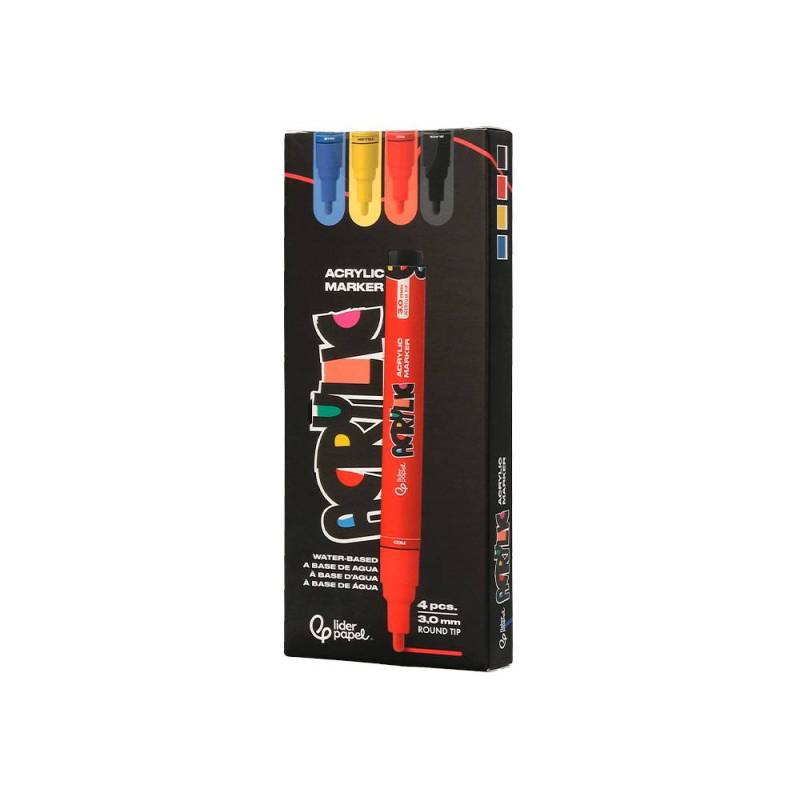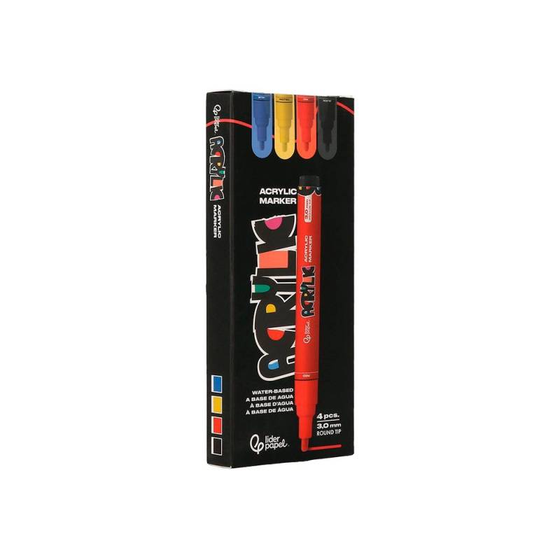 ROTULADOR LIDERPAPEL ACRYLIC BASE AGUA TODO TIPO DE SUPERFICIE PUNTA REDONDA 3 MM CAJA DE 4 UNIDADES COLORES