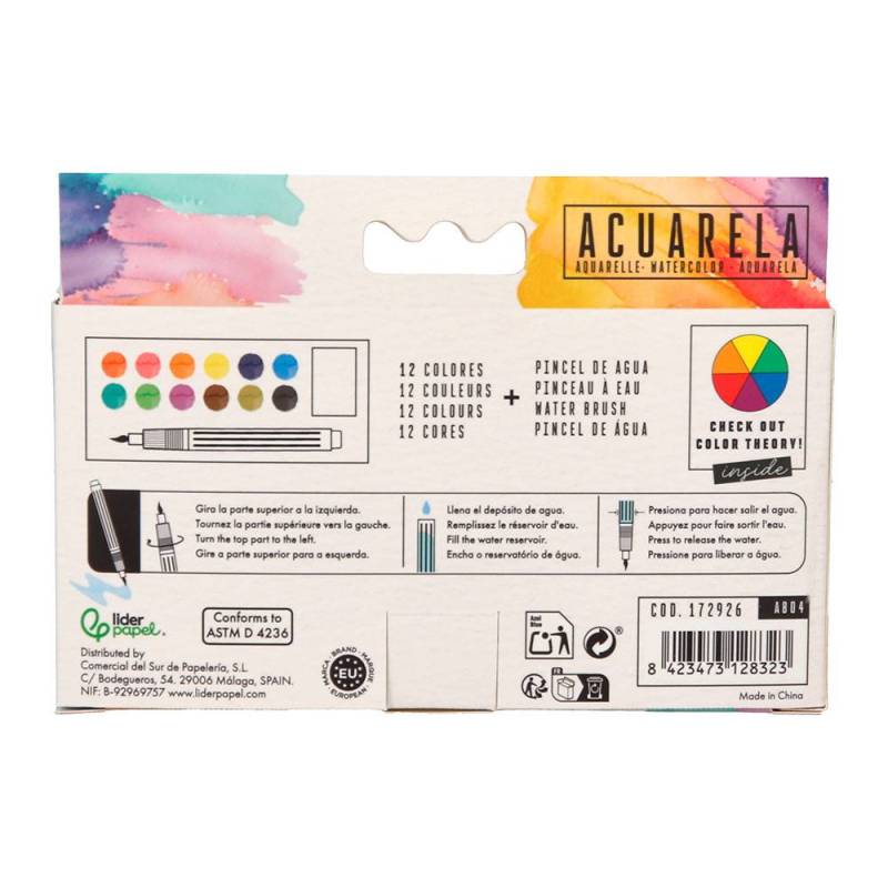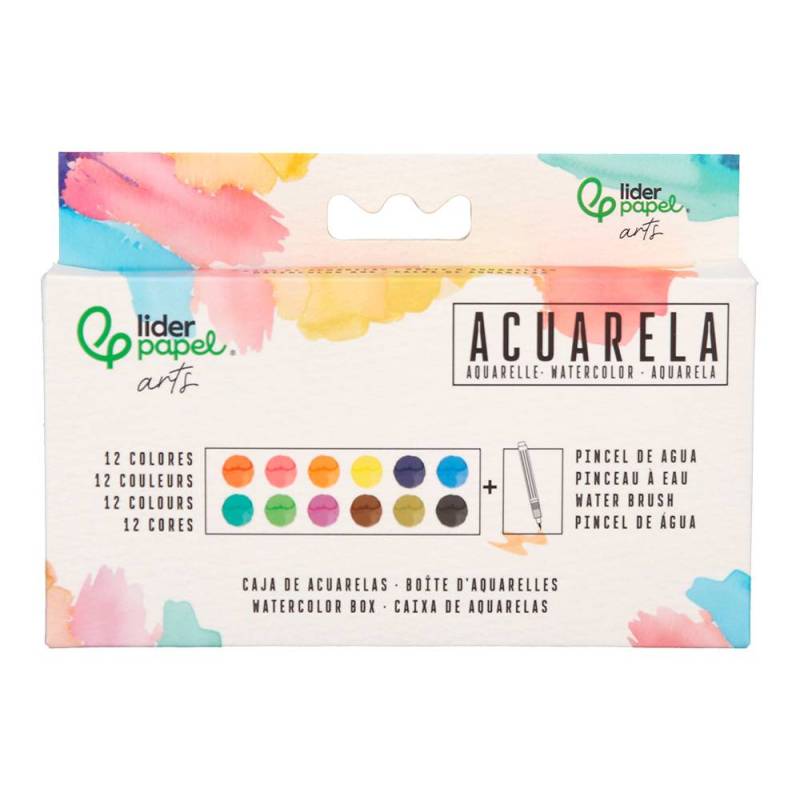 ACUARELA LIDERPAPEL 12 COLORES CON PINCEL DE AGUA RELLENABLE ESTUCHE DE PLASTICO