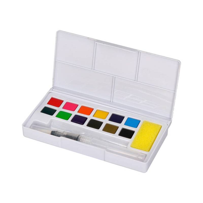 Este set de acuarelas ofrece una solución práctica y completa para quienes desean iniciarse o practicar la pintura con acuarela. Presentado en un estuche compacto de plástico, incluye 12 colores básicos, cuidadosamente seleccionados para permitir una amplia variedad de mezclas y efectos. Su pincel de agua rellenable facilita la aplicación y mezcla de las pinturas sin necesidad de recipientes adicionales, ideal para artistas en movimiento o para uso educativo.