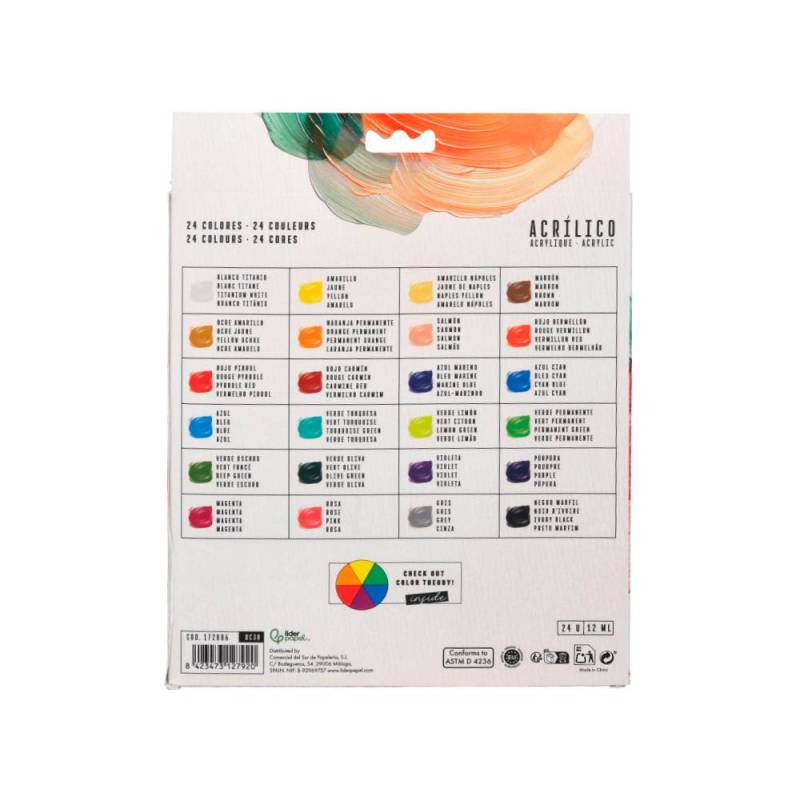 Este set de pintura acrílica en tubos de aluminio incluye 24 colores surtidos en presentaciones de 12 ml cada uno, ideal para artistas, estudiantes y aficionados a las manualidades. Con una fórmula de base agua, estas pinturas ofrecen un secado rápido y una gran versatilidad para diversas técnicas y superficies, facilitando la creación de obras con una amplia gama cromática y acabados variados.