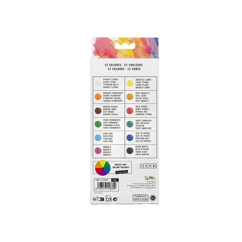 - Colores incluidos: Blanco titanio, Amarillo limón, Naranja permanente, Ocre amarillo, Rojo pirrol, Magenta, Verde permanente, Verde esmeralda, Azul cian, Azul de Prusia, Marrón oscuro y Negro marfil.