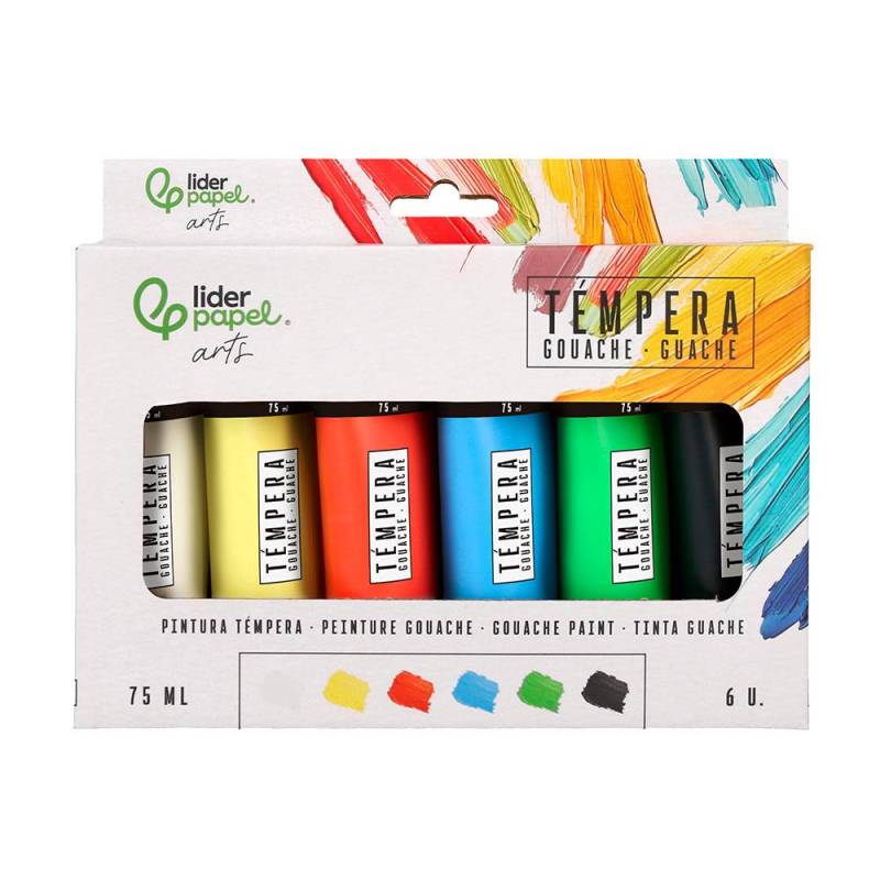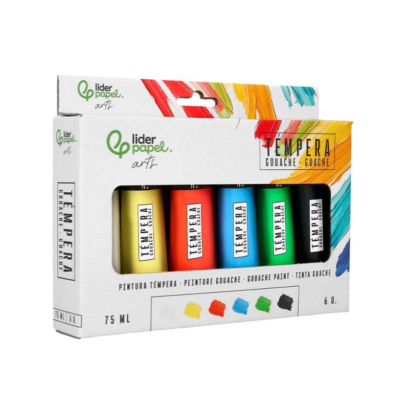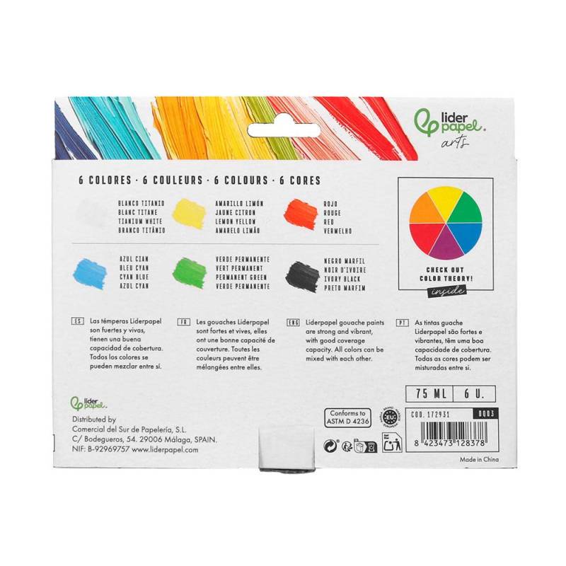 La caja de témperas gouache Liderpap incluye 6 tubos de plástico de 75 ml cada uno, con colores surtidos: blanco titanio, amarillo limón, verde permanente, rojo, azul cian y negro marfil. Esta pintura a base de agua destaca por su opacidad y acabado mate, ideal para trabajos artísticos, escolares y manualidades que requieren colores intensos y uniformes.